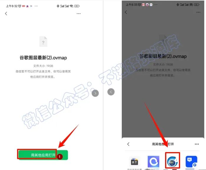 2.把ovmap图源文件发送到手机微信,点击“用其他应用打开”-选择“奥维互动地图”打开