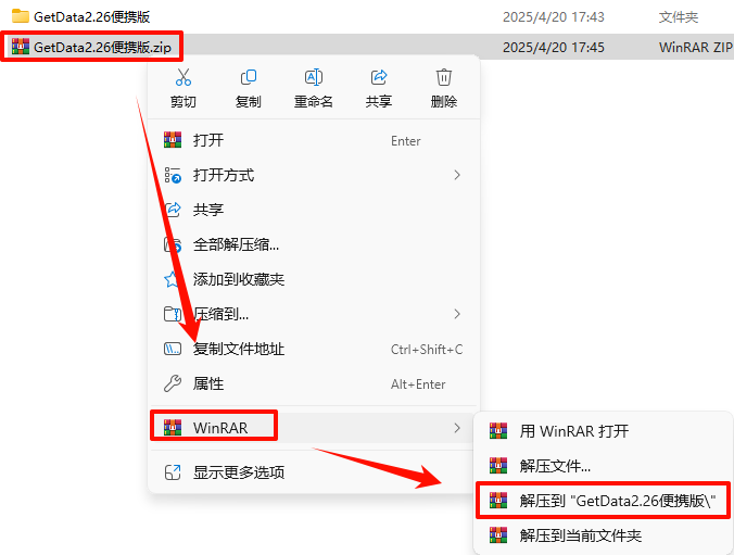 1.选中下载的压缩包,然后鼠标右键选择解压到"GetData2.26便携版"