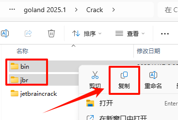 12.·µ»ØÖ®Ç°½âѹµÄ“goland 2025.1”Îļþ¼Ð£¬Ë«»÷´ò¿ª“Crack”Îļþ¼Ð£¬Êó±êÓÒ¼üµã»÷“jetbraincrack”Îļþ¼ÐÑ¡Ôñ“¸´ÖÆ”