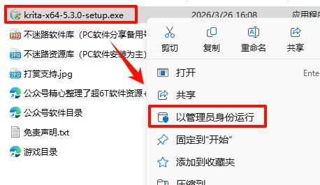 2.´ò¿ª¸Õ¸Õ½âѹµÄÎļþ¼Ð£¬Êó±êÓÒ¼üµã»÷“krita-x64-5.3.0-setup.exe”Ñ¡Ôñ“ÒÔ¹ÜÀíÔ±Éí·ÝÔËÐД