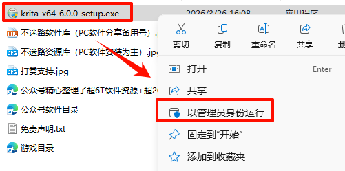 2.´ò¿ª¸Õ¸Õ½âѹµÄÎļþ¼Ð£¬Êó±êÓÒ¼üµã»÷“krita-x64-6.0.0-setup.exe”Ñ¡Ôñ“ÒÔ¹ÜÀíÔ±Éí·ÝÔËÐД
