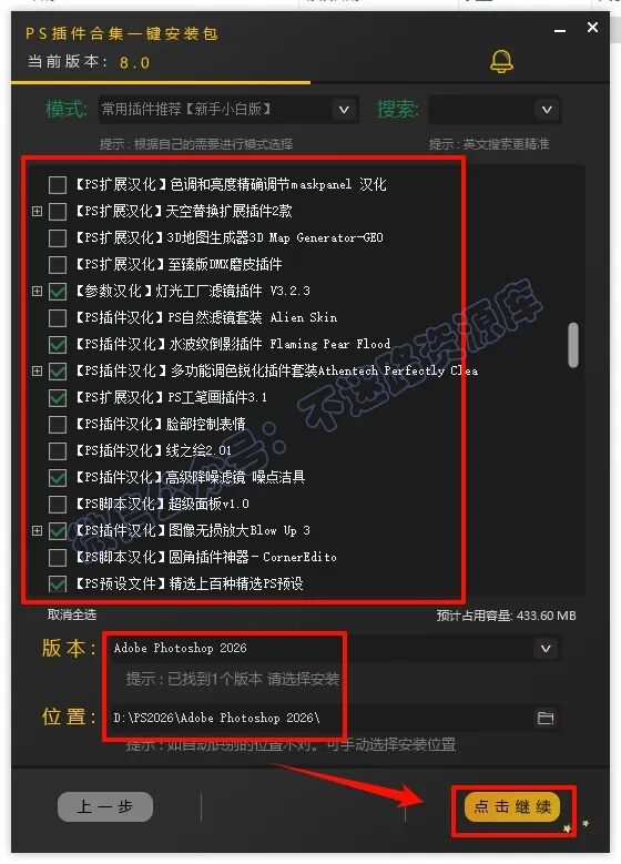 4.根据需要选择安装自己需要的插件,上面还有多种模式可以选择(建议选择一些自己需要的插件即可,装太多没用的插件的话,可能会导致卡顿),软件能自动识别Ps软件版本和安装位置,若电脑上有多个Ps软件版本,请选择需要安装插件的版本,若只有一个Ps软件版本,无需选择;点击“点击继续”