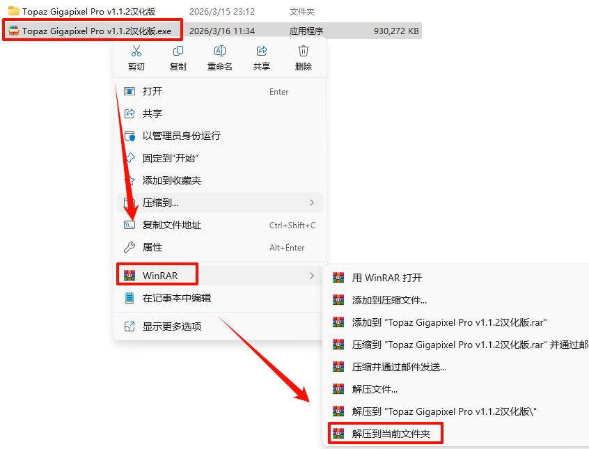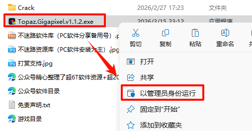 2.打开刚刚解压的文件夹,鼠标右键点击“Topaz.Gigapixel.v1.1.2.exe”选择“以管理员身份运行”