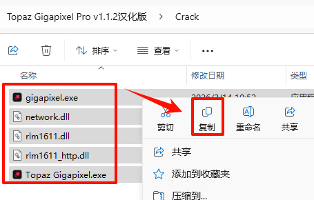 10.返回之前解压的“Topaz Gigapixel Pro v1.1.2汉化版”文件夹,双击打开“Crack”文件夹,选中全部文件,鼠标右键点击“复制”