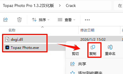 10.返回之前解压的“Topaz Photo Pro 1.3.2汉化版”文件夹,双击打开“Crack”文件夹,选中全部文件,鼠标右键点击“复制”