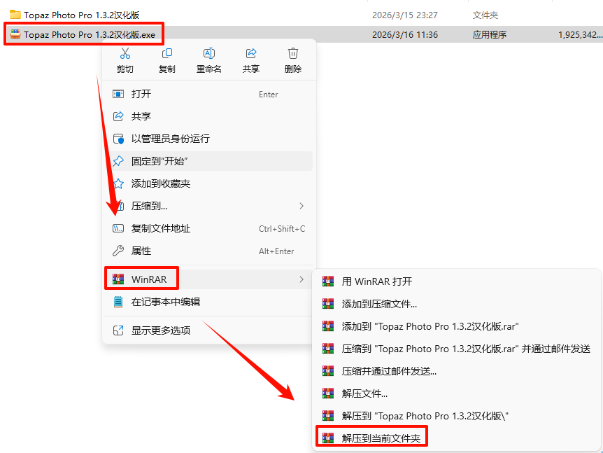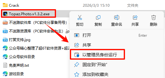 2.打开刚刚解压的文件夹,鼠标右键点击“Topaz.Photo.v1.3.2.exe”选择“以管理员身份运行”