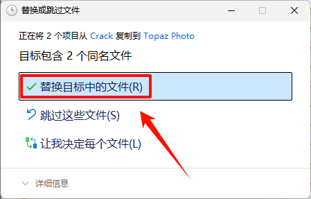 13.点击“替换目标中的文件“(若提示需要管理员权限,勾选“为所有...”,点击“继续”)