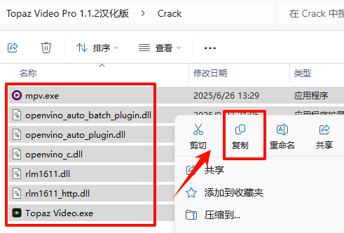 11.返回之前解压的“Topaz Gigapixel Pro 1.1.2汉化版”文件夹,双击打开“Crack”文件夹,选中全部文件,鼠标右键点击“复制”