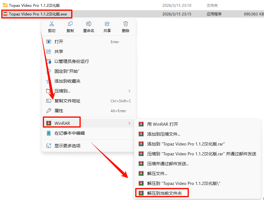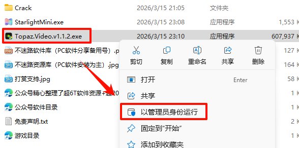 2.打开刚刚解压的文件夹,鼠标右键点击“Topaz.Video.v1.1.2.exe”选择“以管理员身份运行”
