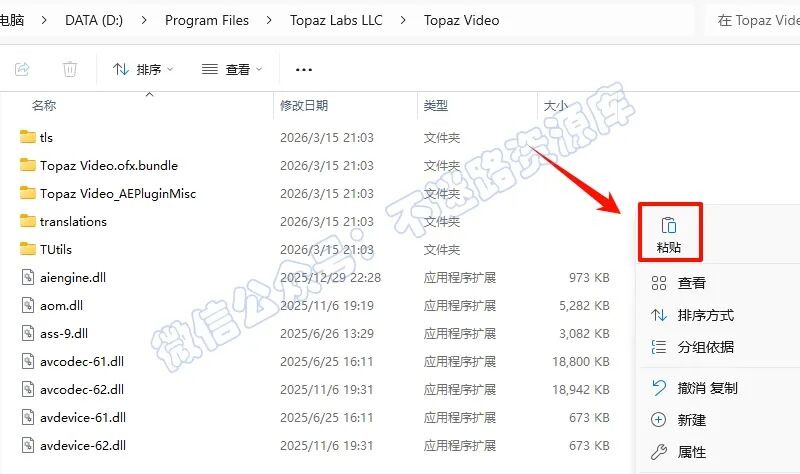 12.依次打开软件目录:D:\Program Files\Topaz Labs LLC\Topaz Video(参看第5步),在打开的文件夹空白处,鼠标右键“粘贴”刚才复制的文件